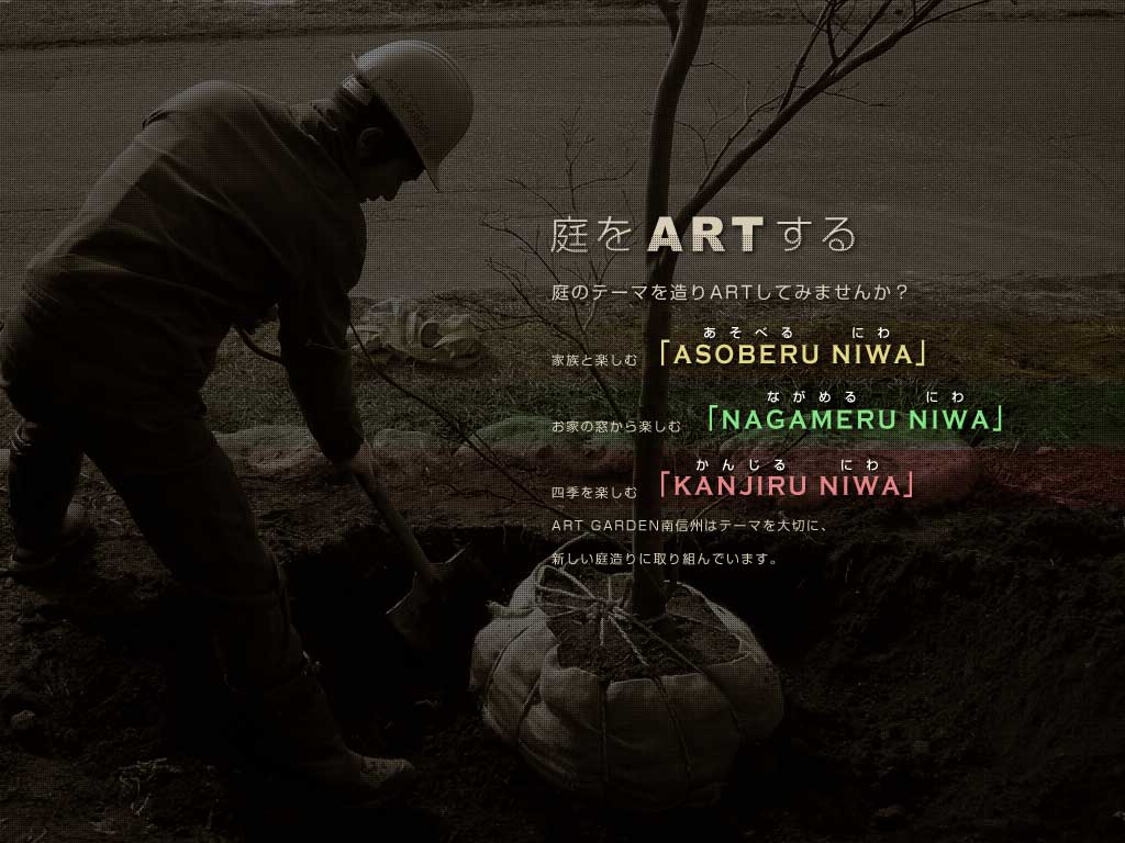 庭のテーマを造りARTしてみませんか? 家族と楽しむ「ASOBERU NIWA」 お家の窓から楽しむ「NAGAMERU NIWA」 四季を楽しむ「KANJIRU NIWA」 ART GARDEN南信州はテーマを大切に、 新しい庭造りに取り組んでいます。